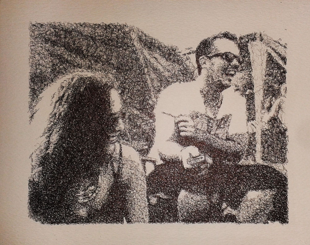 title: "Couple Camping" date: November 2015 size: 26.5cm x 21cm (about A4) medium: ballpoint pen (BIC medium biro) surface: watercolour paper (140lbs Not) status: private owner source: photograph comment: Some ink reflection caused by camera flash, most noticably on dark regions nearer center. |