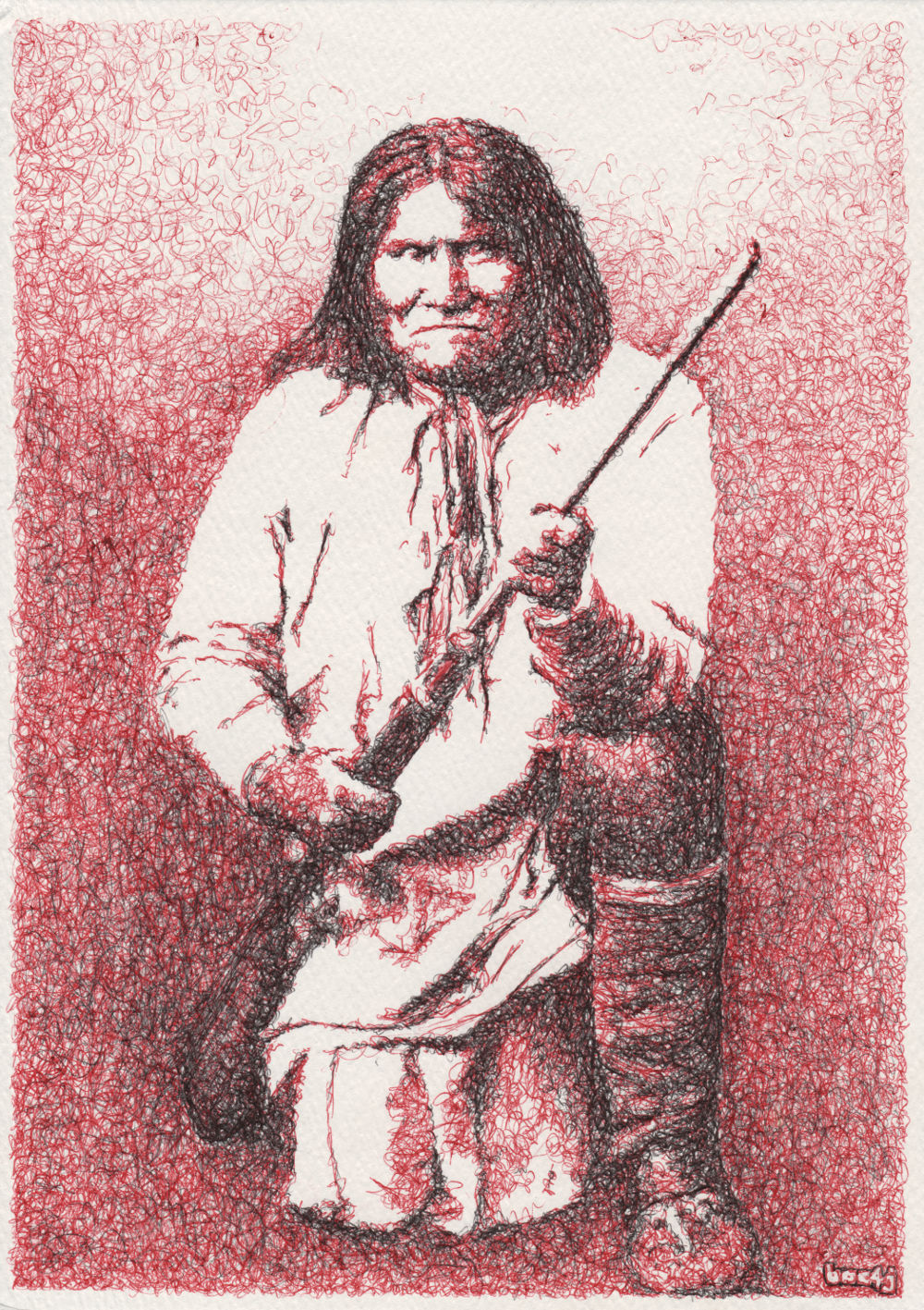 title: "Geronimo" date: May 2016 size: 21cm x 29.5cm (A4) medium: ballpoint pens (BIC fine biro, Bic medium red biro) surface: watercolour paper (140lbs Not) status: personal collection source: scan (600dpi) comment: based on 1887 photograph of famous Apache war leader Geronimo - - - L I N K S - - - Zazzle - buy prints/merchandise DeviantArt - buy prints |