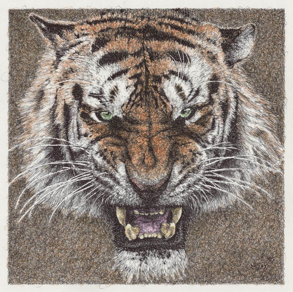 title: "Snarling Tiger" date: July 2017 size: 28cm x 28cm medium: ballpoint pens (black BIC medium biro + assorted colours) surface: watercolour paper (140lbs Not) status: personal collection source: scan (600dpi) - - - L I N K S - - - Zazzle - buy prints/merchandise DeviantArt - buy prints |